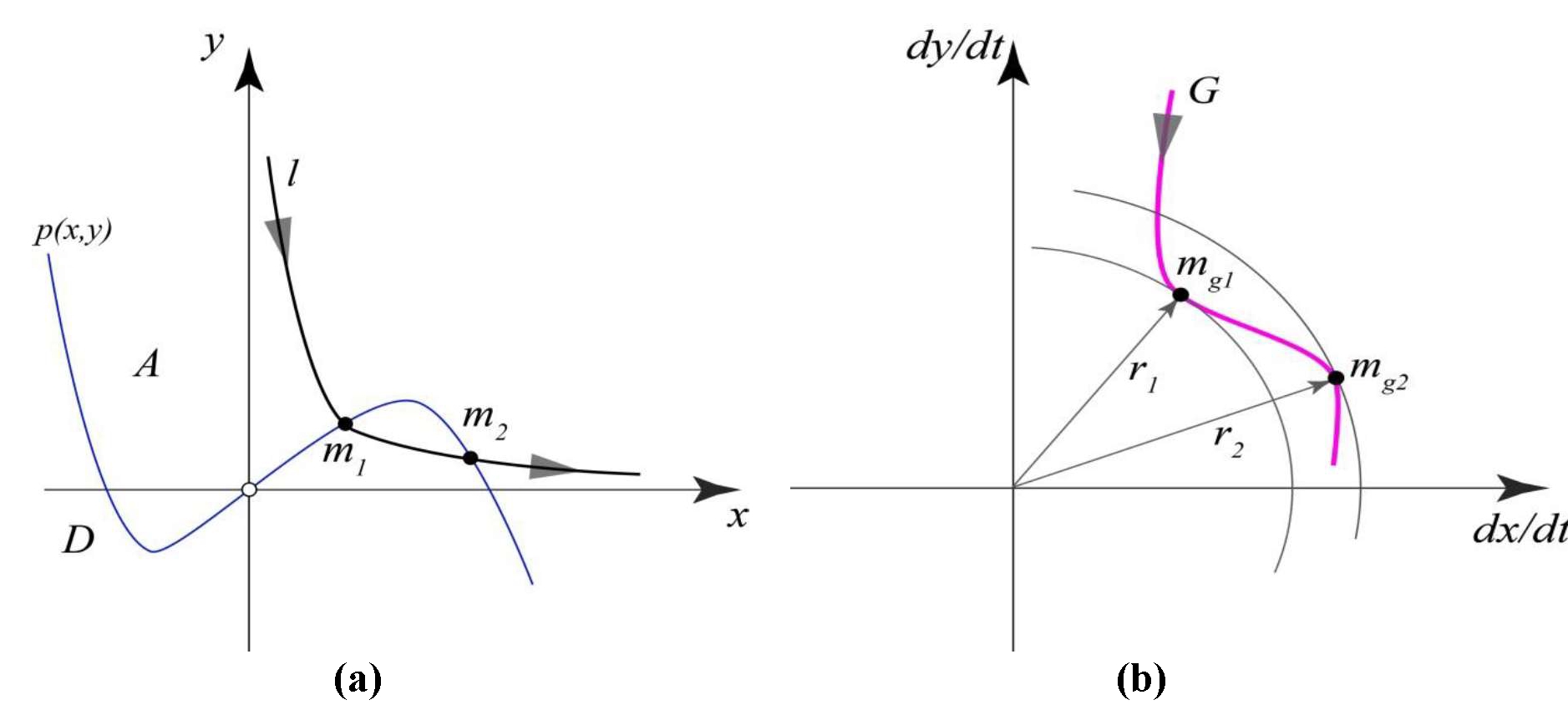 Допустим, в динамической системе (4) произошли изменения, что нашло отражение в изменении коэффициентов . Обозначим исходный набор коэффициентов , а измененный . Далее будем рассматривать две траектории l1 и l2, выпущенные из одной точки фазовой плоскости (рис. 6a). Траектория l1 ‒ решение (4), если коэффициенты равны , l2 ‒ если . Закон изменения состояний динамической системы для первого случая определен парой (m1, r1), а для второй ‒ (m2, r2). Закон изменения состояний динамической системы изменился качественно, так как число экстремумов осталось прежним, изменилось только значение фазовой скорости (рис. 6).