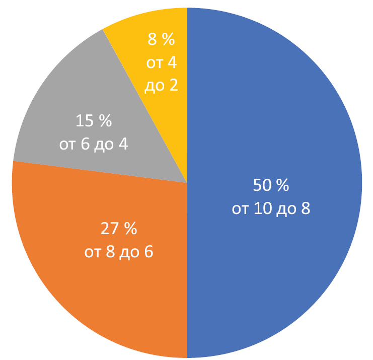 На первом этапе респондентам нужно было перечислить пять любых дисциплин, которые они изучают. Респонденты называли дисциплины, не зная, что их предстоит оценивать. Это обеспечило нам чистоту исследования. Затем, на втором этапе, им было предложено оценить свой уровень комфорта по десятибалльной шкале от 0 до 10. Для снятия разночтений в трактовке понятия «психоэмоциональный дискомфорт» обучающимся было приведено в качестве стимула теоретическое определение. Усредненная оценка респондентов от 10 до 8 квалифицировалась как очень высокий уровень комфорта, от 8 до 6 как высокий уровень комфорта, от 6 до 4 как средний уровень комфорта, от 4 до 2 как низкий уровень комфорта, от 2 до 0 как очень низкий уровень комфорта. Всего респондентами было оценено 26 разных дисциплин. Были получены следующие результаты: на 13 дисциплинах, что составляет 50 % от общего количества проанализированных учебных дисциплин, уровень психоэмоционального комфорта был оценен как очень высокий; на 7 дисциплинах — это 27 % от общего количества проанализированных учебных дисциплин, студенты оценили свой уровень комфорта как высокий; на 4 дисциплинах (15 %) уровень комфорта был оценен как средний; на 2 дисциплинах (8 %) уровень комфорта обучающихся был низкий. Оценки с показателем — очень низкий уровень психоэмоционального комфорта — отсутствовали (рис. 1).