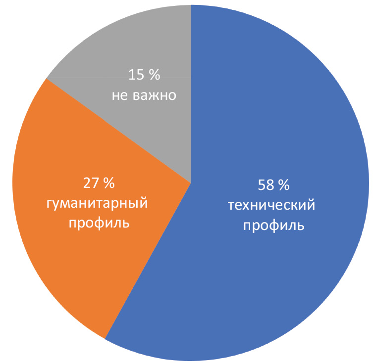 Затем мы попытались выяснить, чем продиктована разная частотность появления разных дисциплин, и проанализировать зависит ли психоэмоциональный комфорт от типа дисциплины, ее принадлежности к гуманитарному профилю или к техническому. Гуманитарный или технический склад ума предполагает не только предрасположенность и успех в определенных предметах; но и особый характер мышления, набор черт характера. Мы опросили студентов, где им более комфортно в психоэмоциональном плане — на дисциплинах гуманитарного или технического профиля, принимая во внимание то, что они являются обучающимися в техническом вузе. 58 % респондентов ответили, что им более комфортно на дисциплинах технического характера. 27 % респондентов более комфортно чувствовали себя на дисциплинах гуманитарного характера. 15 % респондентов ответили, что они чувствуют себя одинаково комфортно на дисциплинах технической и гуманитарной направленности. Ответов, что обучающиеся чувствуют себя одинаково дискомфортно на дисциплинах гуманитарного и технического цикла, получено не было (рис. 2).