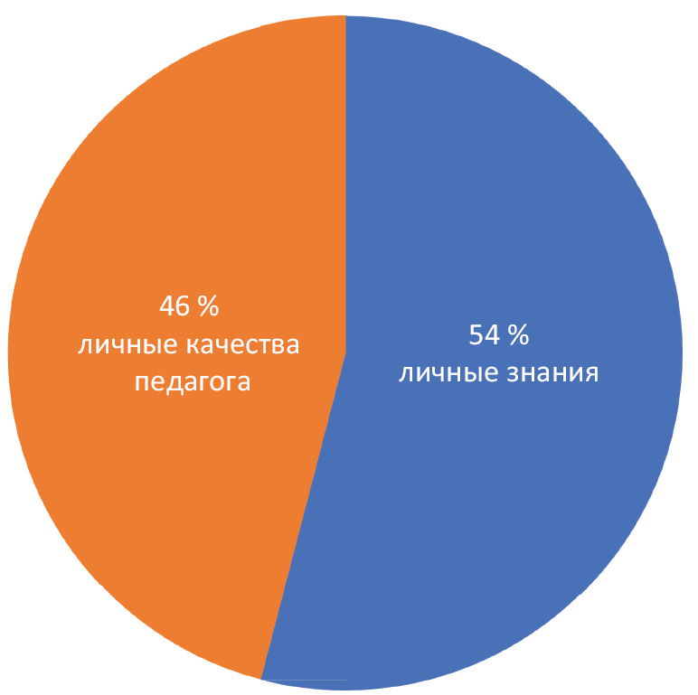 Проведенное исследование свидетельствует, что на уровень психоэмоционального комфорта влияет не только характер дисциплины. Мы попытались выявить посредством дальнейшего опроса, что еще является источником психоэмоционального дискомфорта на занятиях. Оказалось, что в большинстве случаев (54 %) источником психоэмоционального дискомфорта является нехватка знаний у самих обучающихся. В 46 % ответов в качестве источника дискомфорта называются личные качества педагога (рис. 3).