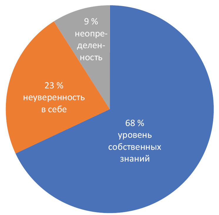После экспликации внешних факторов, влияющих на психоэмоциональное состояние обучающихся, мы изучили более детально, какие внутренние факторы становятся причиной возникновения психоэмоциональных барьеров. Опрос показал, что у 68 % респондентов причиной возникновения дискомфорта является уровень собственных знаний, который не соответствует уровню, предъявляемому в рамках изучаемого предмета или дисциплины.