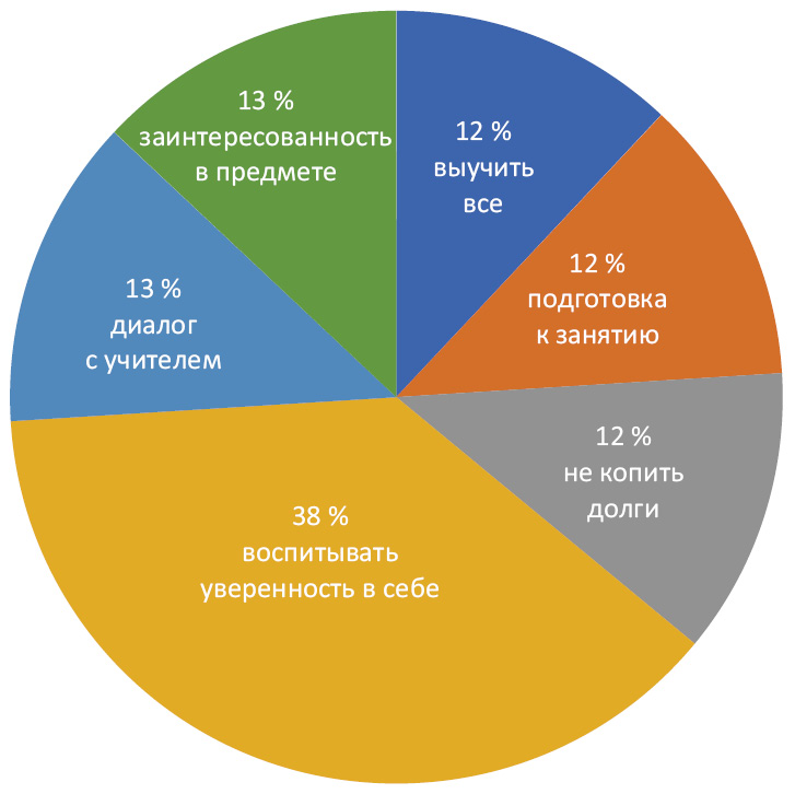 Следующим этапом исследования стало изучение способов преодоления дискомфорта, предложенных обучающимися. Оказалось, что 74 % респондентов готовы самостоятельно решать возникающие у них психоэмоциональные проблемы. 38 % респондентов видят выход из ситуации в воспитании уверенности в себе, стрессоустойчивости. 12 % респондентов считают, что проблема уйдет, если выучить все, что касается темы занятия. Еще 12 % близки к предыдущей группе и считают, что более тщательная подготовка к уроку снимет напряжение и стресс, поднимет уверенность в собственных силах. Эквивалентная по количеству группа респондентов (12 %) сошлась во мнении, что уровень дискомфорта увеличивается прямо пропорционально количеству долгов, чем больше задолженностей, тем больше уровень испытываемого дискомфорта. Оставшиеся респонденты не могут или не готовы самостоятельно решать проблемы психоэмоционального характера характера на уроке. 13 % из общего количества респондентов нуждается для стабилизации своего состояния в конструктивном диалоге с преподавателем. Еще 13 % не видят причины в себе, а ссылаются на низкую мотивированность и видят функцию педагога не только в преподавании учебного материала, но и в формировании мотивационной базы у обучающихся (рис. 6).
