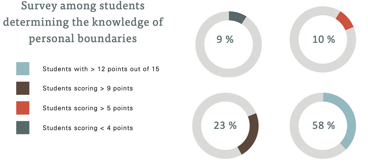 So, to sum up all the above outcomes, it’s necessary to notice that most students are not familiar with the concept of personal boundaries or face it quite rarely. Such a picture indicates adults’ misunderstanding of the topic and obvious violations’ presence of their own space.