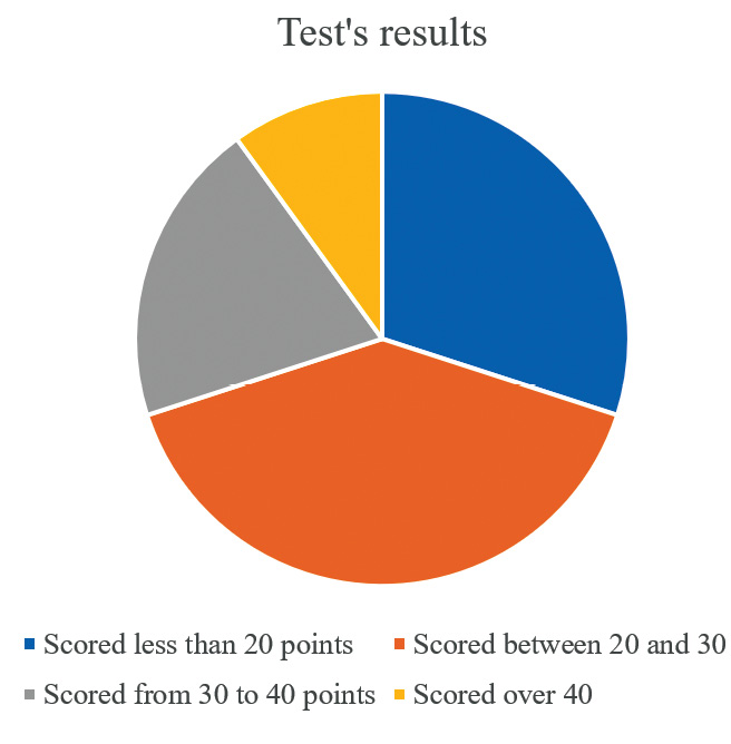 The third step of the survey was performed as a psychological test consisting of 12 questions called “Do you know how to protect your personal space?”. The results of the test were scores from 1 to 47 and brief characteristics of students and their ability to defend personal boundaries. Based on them, it was possible to identify 4 characteristics of students: