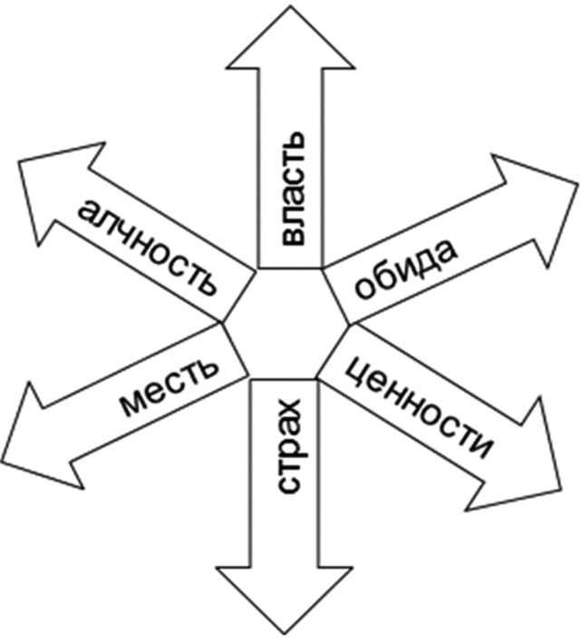 Опираясь на обозначенные общеметодологические положения, осмелимся высказать концепцию: композиция акта измены вызревает из психологических комплексов субъекта, которые являются предикторами поступка; комплексы представлены комплементарными диадами: власть — страх, обида — месть, алчность — девальвация ценностей (рис. 1).