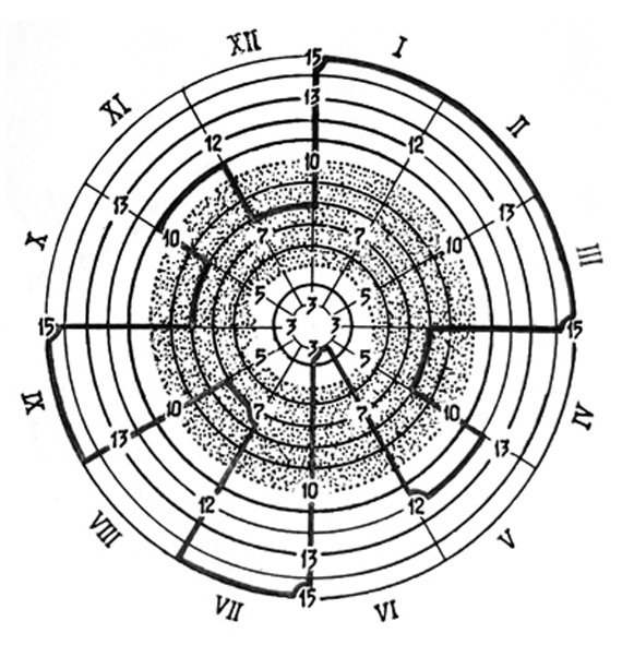 Отдельное оценочное суждение респондента не является диагностичным. Позиции, описывающие однотипные ситуации в опроснике, группировались в триады и объединялись в блоки по мотивационным признакам. По совокупности суждений волонтера о субъективно значимых для него ситуациях по шкалам I...XII подсчитывались мотивационные индикаторы нравственно-этического отношения к действиям аттестуемого субъекта. По каждой шкале может быть набрано в сумме от 3 до 15 баллов. Индивидуальные результаты представляются в виде круговой диаграммы, принцип построения которой заимствован у Т. Лири [29].