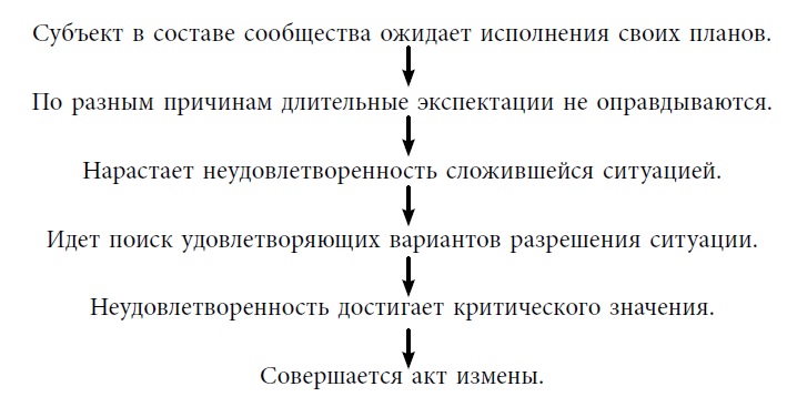 В динамике функция измены представляет собой цепочку действий, типичную как для субъектов больших сообществ, так и для малых групп, например, семьи.
