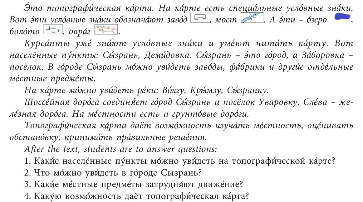 When studying the topic «The city in which I live», students are invited to study the text «Topographic map», which focuses on the use of Russian proper names (names of geographical objects). When working with this text, it is necessary to use visibility materials: a topographic map of Syzran/Samara.