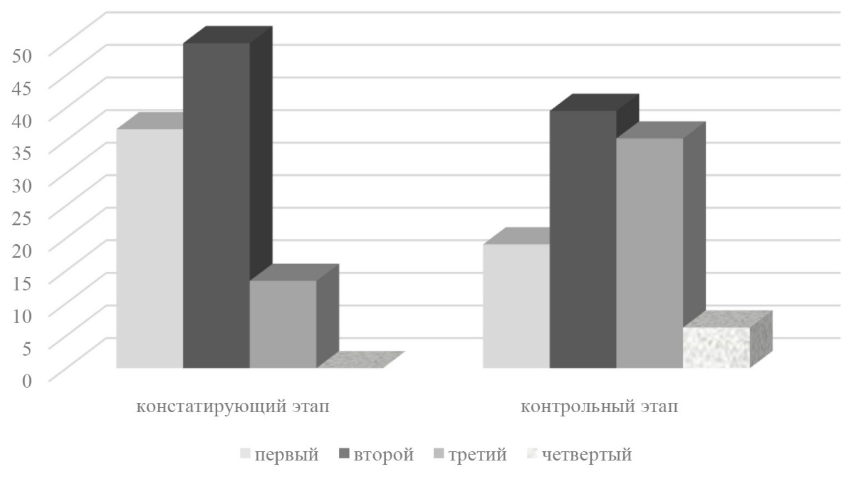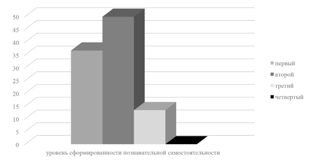 Сравнительный анализ полученных данных показывает, что количество студентов, находящихся на первом уровне сформированности познавательной самостоятельности на констатирующем этапе нашего исследования, уменьшилось на 17,7 %, на втором уровне произошло уменьшение на 10,4 %, на третьем – увеличение на 21,9 %. По результатам проведенного нами исследования мы отметили, что 6 студентов (6,24 %) показали творческий, четвертый уровень сформированности познавательной самостоятельности (рис. 7).