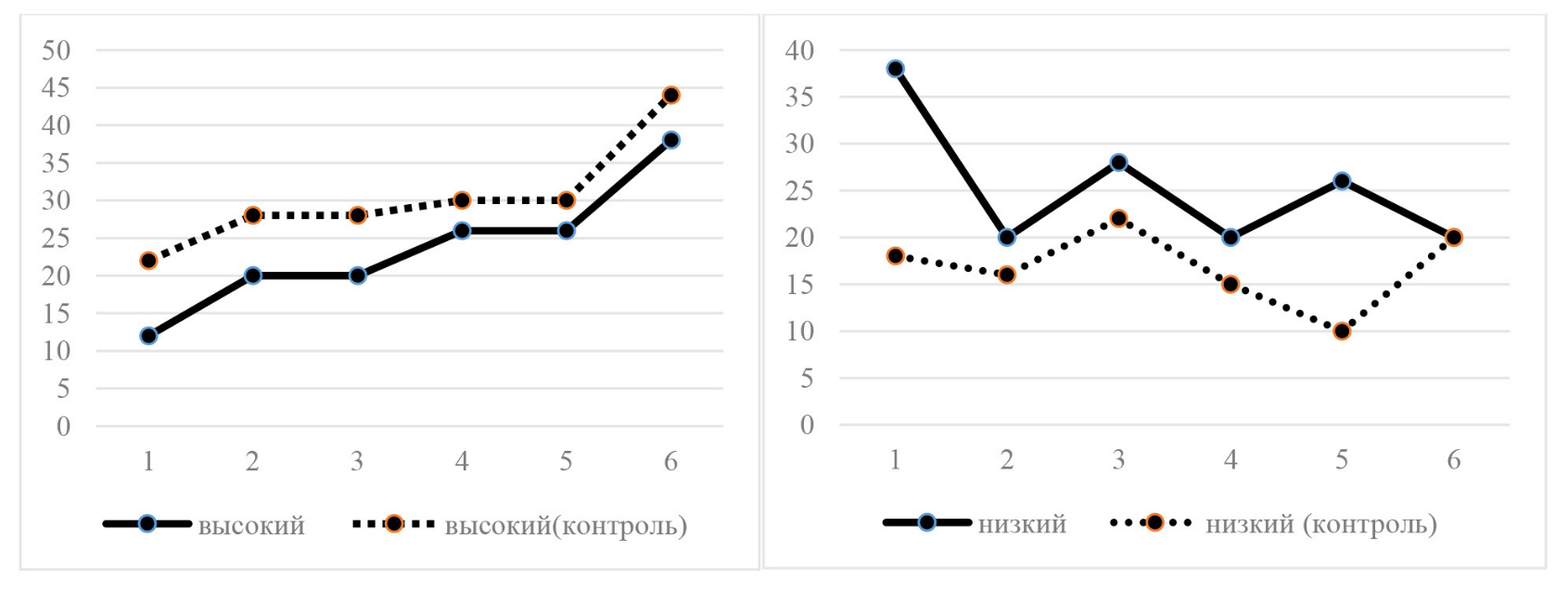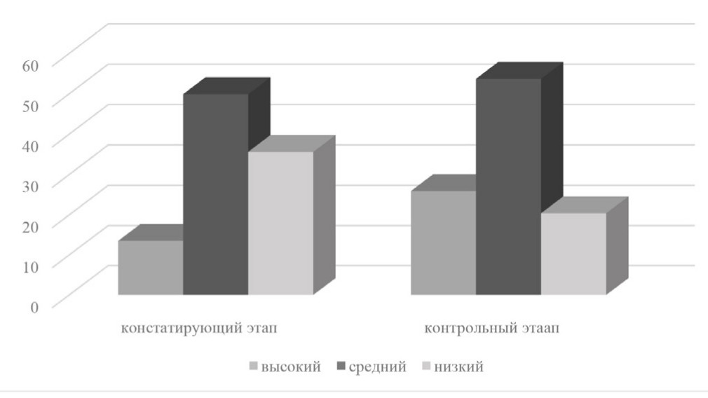Результаты диагностики уровня развития внутренней мотивации учебной деятельности обучающихся по методике Т.Д. Дубовицкой на контрольном этапе исследования показали, что количество студентов, находящихся на среднем уровне, изменилось незначительно. Это можно объяснить тем, что количество студентов на высоком уровне увеличилось (на 16,7 %), а на низком – уменьшилось (на 14,6 %). Это подтверждает вывод об эффективности применения практико-ориентированных заданий в процессе обучения студентов. Сравнительный анализ уровня развития внутренней мотивации учебной деятельности студентов на занятиях естественно-научных дисциплин по методике Т.Д. Дубовицкой на констатирующем и контрольном этапах исследования представлен на рис. 6.