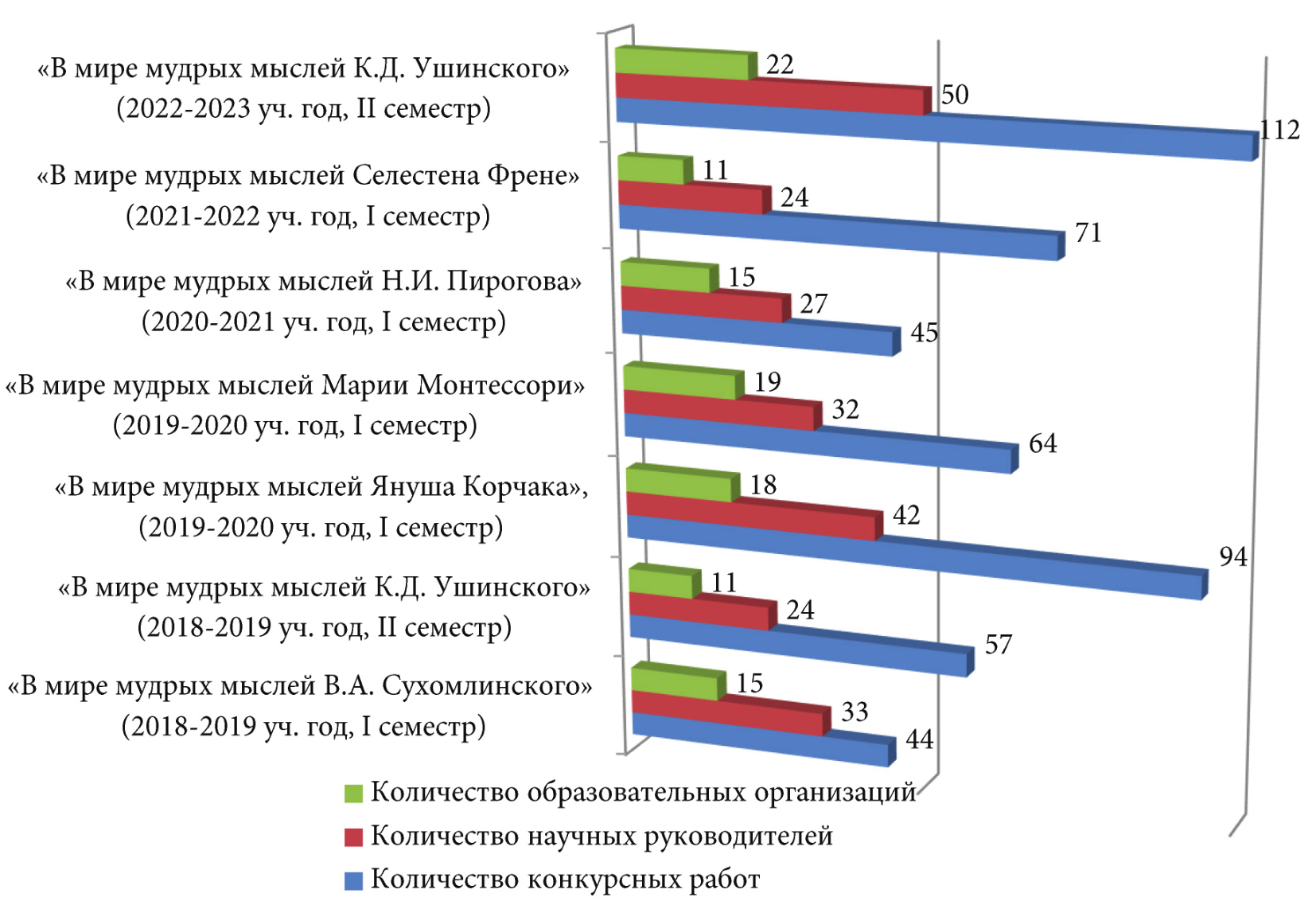 В целях повышения престижа учительской профессии, роста количества мотивированных абитуриентов, их поддержки опытными педагогами и наставниками объективно возникает потребность обращения к историко-педагогическому опыту подготовки учителей. Историко-педагогический поиск позволил продемонстрировать значимость проведения Международного конкурса научно-исследовательских и творческих работ студентов «В мире мудрых мыслей К.Д. Ушинского». Отмечается положительная динамика участия в международном конкурсе научно-исследовательских и творческих работ студентов (см. рисунок).