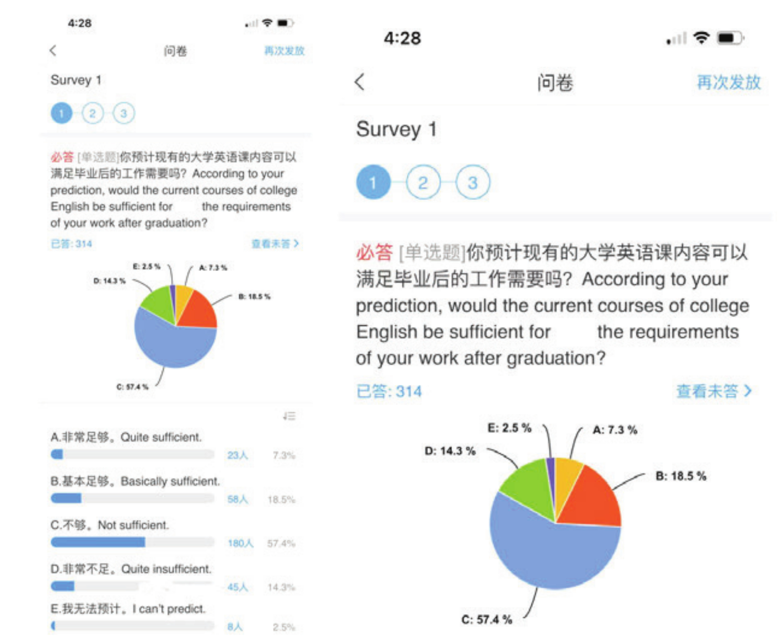 In a survey conducted via SuperStar app on Oct.12, 2021, 500 engineering-majored freshmen are inquired on a satisfaction rating towards the English courses. The research team led by the author received 314 answers (sample size 314), which is shown in Figure 4 [14].