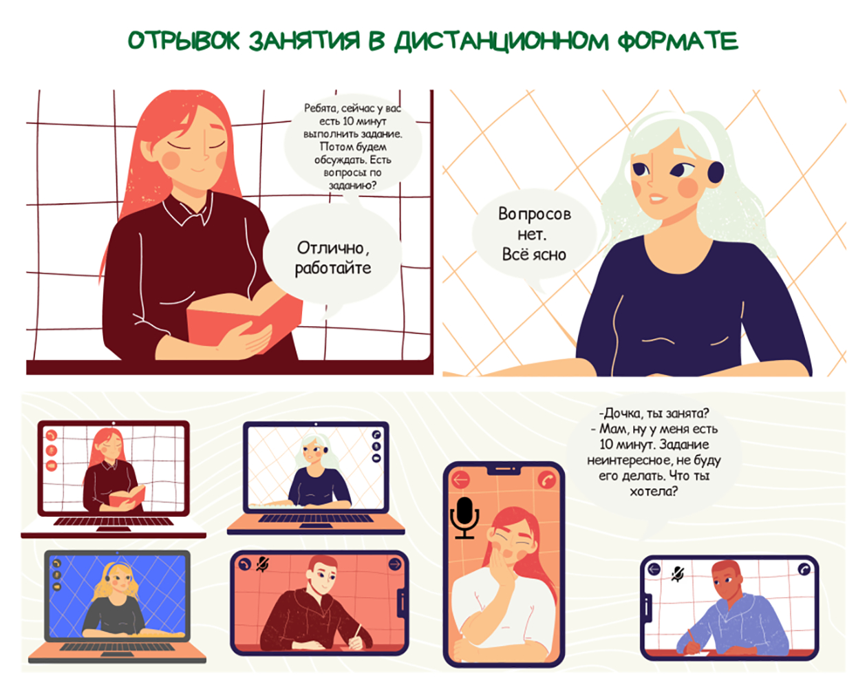 - «Услышат всех»: микрофон должен быть включен только во время ответа/вопроса ученика, чтобы избежать технических неполадок;