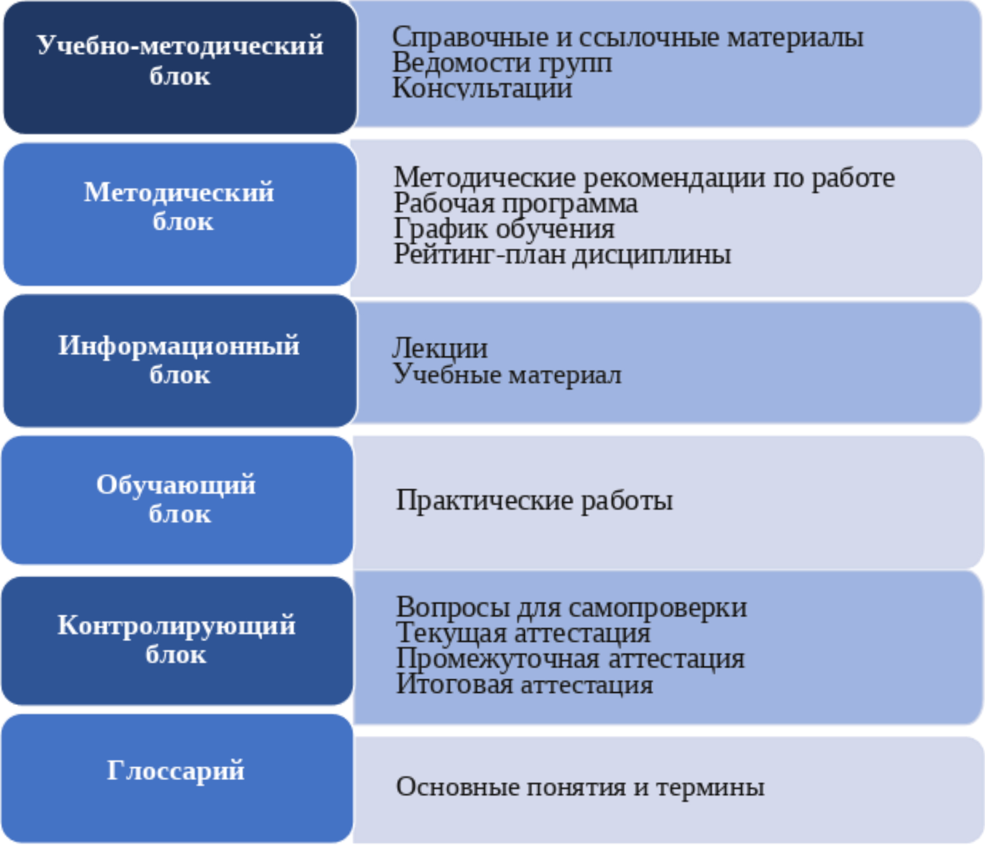 Методический блок содержит методические рекомендации по работе с ЭОР, рабочую программу дисциплины, график обучения и рейтинг-план дисциплины.