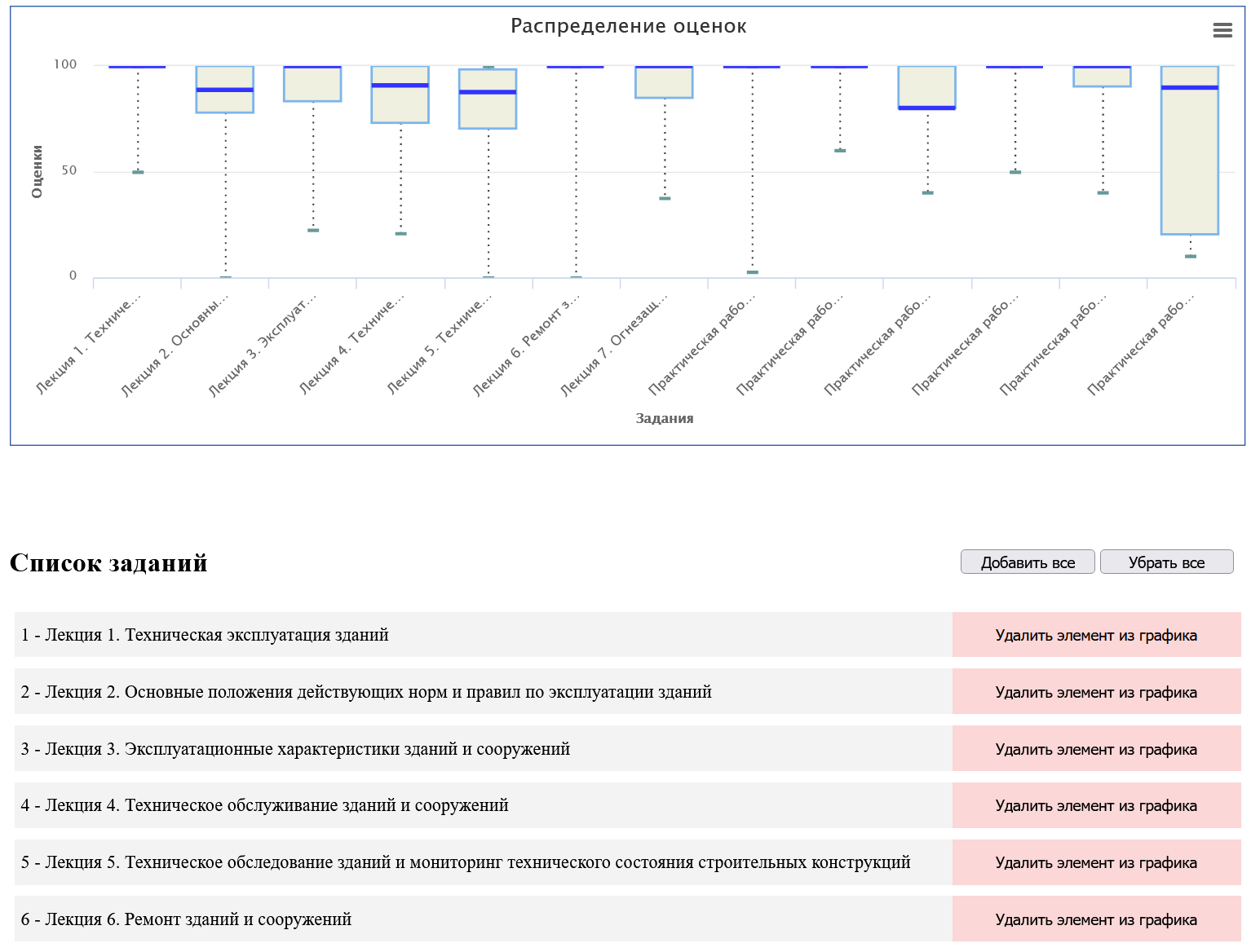 На рис. 2 представлены результаты выполнения заданий с распределением оценок среди обучающихся на курсе. Эти данные, как и графики посещения, прохождения заданий и тестовых элементов курса, позволяют оценивать активность студентов.
