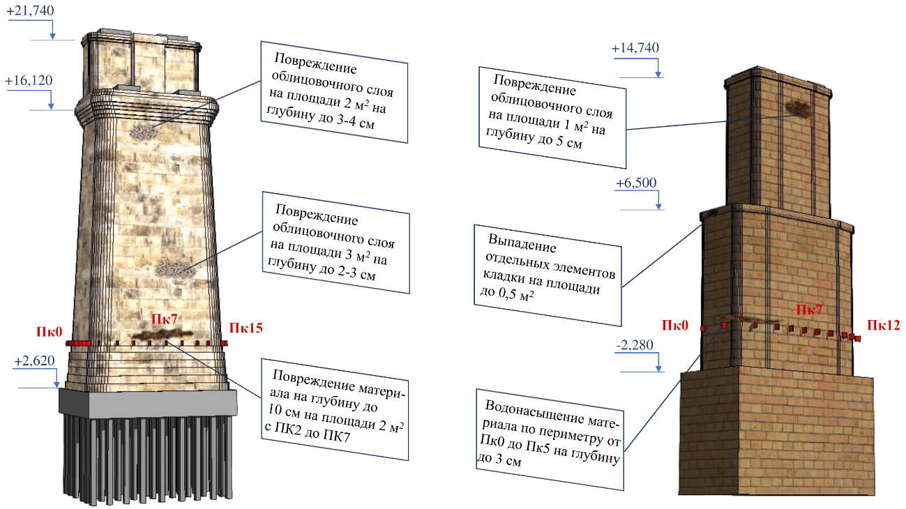 Рис. 6. Пример цифровой модели опор моста с контрольными метками и выявленными дефектами для последующих обследований и сопоставления реального состояния и достигнутого при обследовании