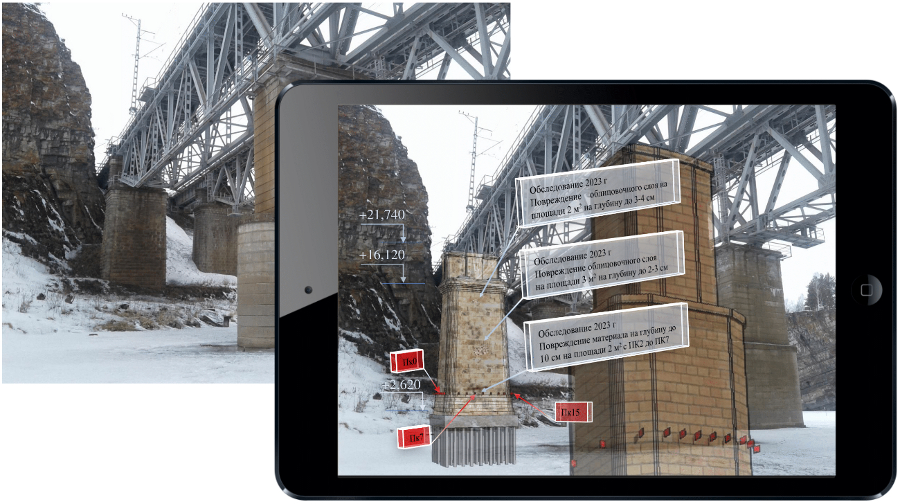 – создание цифровой модели отдельных опор моста с указанием выявленных в ходе обследования дефектов и повреждений (рис. 5);