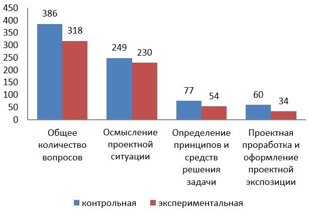 В экспериментальных группах вопросы были сконцентрированы в первой половине процесса проектирования, на стадии осмысления проектной ситуации. Вопросы, направленные на уточнение условий заданий, на ликвидацию недостающих знаний, были заменены на проблемные, выявляющие сущностные характеристики объекта проектирования. Анализ заданных вопросов помог спланировать дальнейшую экспериментальную работу.