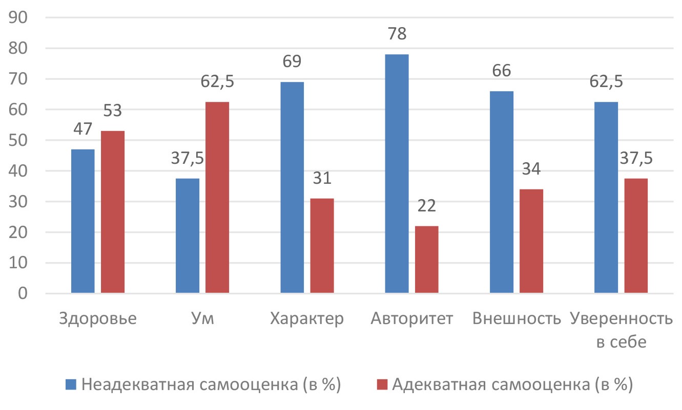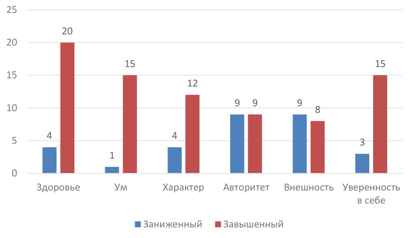 На рис. 2 можно увидеть, что число студентов с заниженной самооценкой по параметру «авторитет» – 50 %, то есть это самый проблемный параметр, по параметру «внешность» и «характер» – 37,5 %, что также является немалым числом, по параметру «уверенность в себе» – 34 %, по параметру «здоровье» – 25 %, а по параметру «ум» – 22 %.