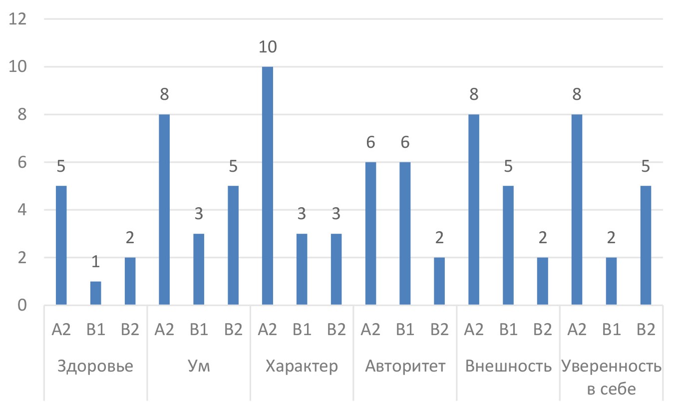 На рис. 3 видно, что по всем параметрам самооценки – «характер», «внешность», «авторитет», «уверенность в себе», «ум» и «здоровье» – число студентов с уровнем иностранного языка A2 превышает число студентов с уровнями B1 и B2.