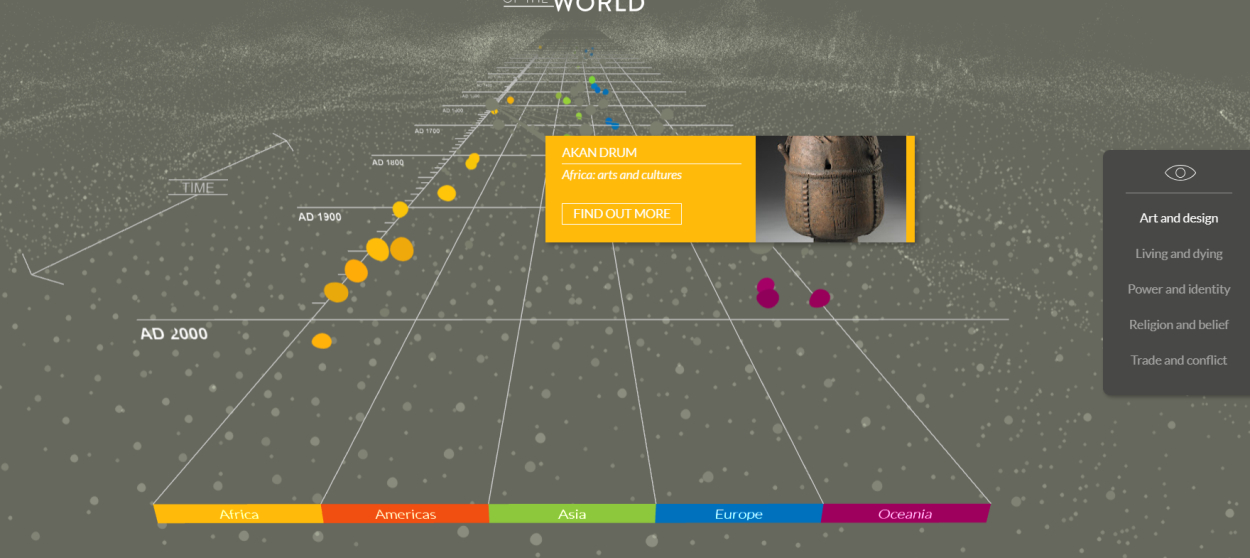 Let us turn to the virtual museum «The British Museum» in order to get acquainted with the possibility of using the virtual museum environment as a source of linguistic-country studies materials for the English language classes. The museum model is quite peculiar: the visitor is presented with a timeline on which he/she can choose the period and topic of interest: for example, the topic «Art and design» (Figure 1).