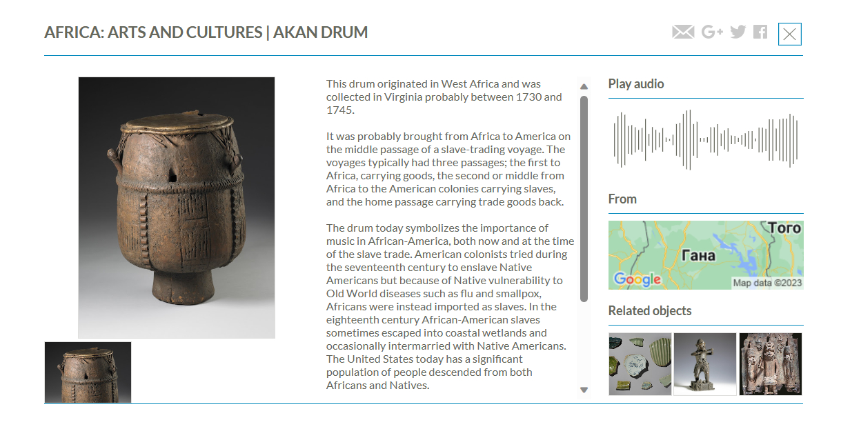 Navigating through the museum’s website gives students the opportunity to choose the subject of the exhibition and the way they want to familiarize themselves with the material (reading, listening, etc.). For example, in the table provided, students can select a particular exhibit: e.g. Africa; Arts and Cultures / Akan drum (Figure 2).