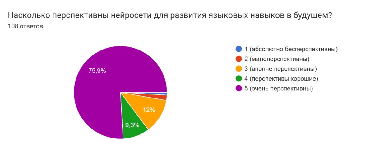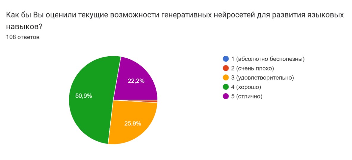 Онлайн-опрос показал, что студенты по-разному относятся к текущим возможностям генеративных нейросетей для развития языковых навыков (рис. 1), что может быть связано с неоднородностью их практического опыта. Перспективы нейросетей были оценены преимущественно высоко, однако не все обучающиеся разделяют технологический энтузиазм (рис. 2).