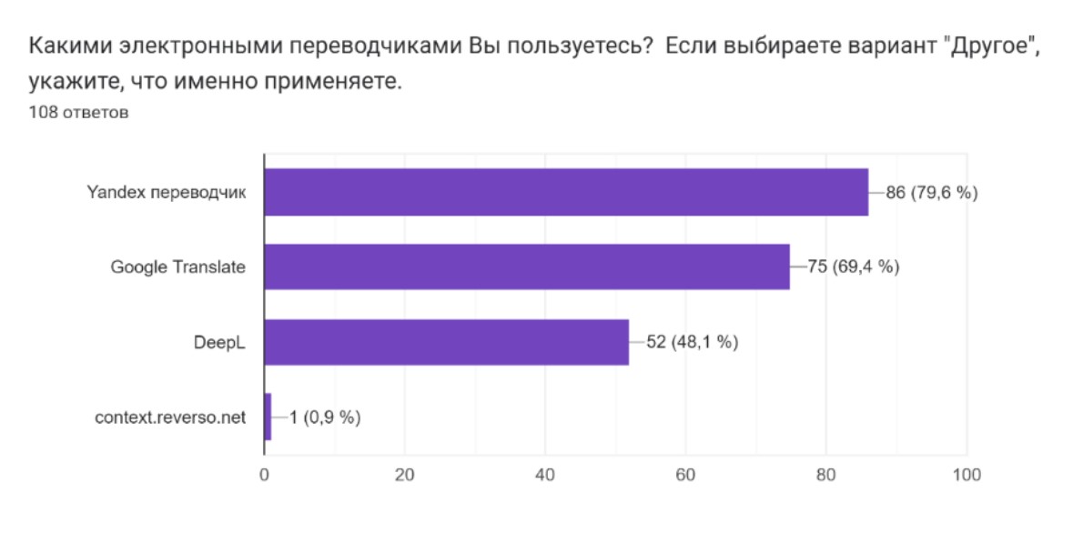 При работе с лексикой немаловажное значение имеют словари. Причем электронные словари и переводчики давно вытеснили свои печатные (бумажные) аналоги. Современные переводчики преимущественно работают на нейросетевых моделях, благодаря чему существенно улучшается качество текста. Онлайн-опрос показал, что многие студенты применяют сразу несколько переводчиков (рис. 3), выбирая наиболее адекватные эквиваленты и структуры из вариантов, предложенных разными базами, что свидетельствует о наличии основ переводческой грамотности у обучающихся.