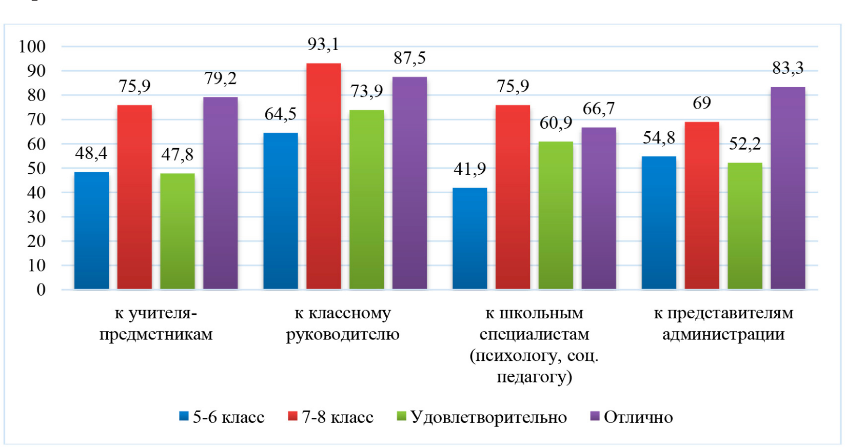 Коммуникация со школой. Большинство родителей отметили, что имеют возможность обратиться к различным специалистам школы по вопросам успеваемости ребенка, его поведения, отношений с одноклассниками: чаще других упоминался классный руководитель – 78,3 %, учителя-предметники и представители администрации – по 61,7 %, реже – школьные специалисты: психолог, социальный педагог – 58,3 %. Однако около 20 % опрошенных отметили, что не имеют такой возможности. Можно предположить, что ответы о возможностях обусловлены личным опытом респондентов и отрицательные ответы могут быть связаны не только с невозможностью обращения, но и с отсутствием необходимости. Также, поскольку в вопросе содержится возможность не только обращения, но и получения своевременного ответа, то выбор отрицательного варианта может быть связан с отсутствием обратной связи, т. е. неполноценной коммуникацией со стороны школы. Следует отметить, что чаще о данной возможности заявляют родители учащихся 7-, 8-х классов, а также родители школьников с более высокой успеваемостью (рис. 3). Наименее активными и, возможно, менее удовлетворенными в плане взаимодействия с работниками школы являются родители учащихся с низкой успеваемостью и 5-, 6-классников.