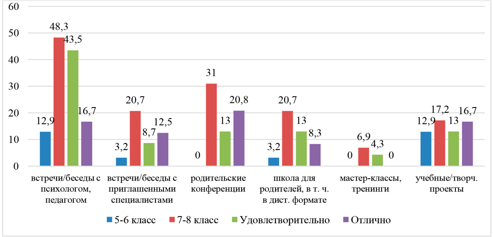 При ответе на вопрос, в каких конкретных школьных мероприятиях они участвуют, большинство отметили, что регулярно принимают участие в родительских собраниях (88,3 %), значительно реже в ответах упоминаются праздники (23,3 %). Также среди периодических мероприятий назывались экскурсии (33,3 %), учебные и творческие проекты (28,3 %), выставки (25 %), совместные досуговые мероприятия (21,7 %), конкурсы и индивидуальные беседы и консультации (по 20 %), круглые столы с родителями (18,3 %). Очевидно, что проводимые школой мероприятия имеют возрастную специфику. Так, наиболее часто родители 5-, 6-классников упоминали экскурсии (41,9 %), а родители 7-, 8-классников – учебные и творческие проекты (41,4 %) и выставки (31 %). Родители учащихся с высокой успеваемостью больше вовлечены в разнообразные школьные мероприятия: экскурсии (37,5 %), выставки (33,3 % против 8,7 % родителей детей с низкой успеваемостью), совместные досуговые мероприятия (33,3 % против 13 %), конкурсы (29,2 % против 17,4 %), круглые столы и конференции (25 % против 13 %). Наиболее предпочитаемыми мероприятиями среди родителей учащихся с низкой успеваемостью являются индивидуальные беседы и консультации, экскурсии, праздники, учебные и творческие проекты (по 30,4 %).