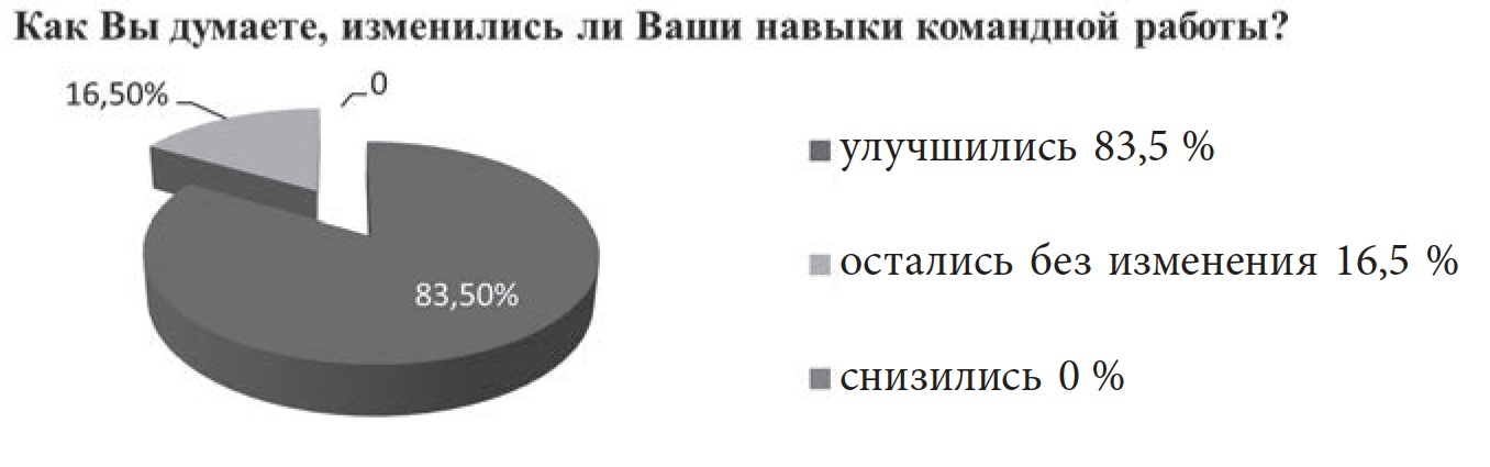 По итогам опроса было установлено, что 83,5 % респондентов отмечают позитивные сдвиги в навыках командной работы.