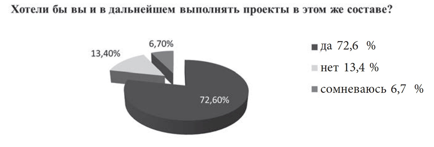 72,6 % отметили, что хотели бы в дальнейшем выполнять проекты в этом же составе, то есть у студентов сформировалась положительная установка на данный вид деятельности и на членов команды (рис. 2).