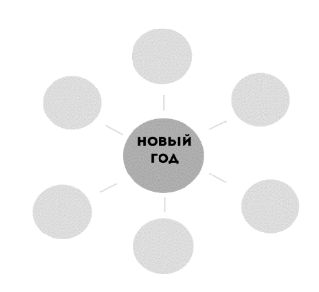 Задание 1. Ассоциативный круг. На доске написано словосочетание «Новый год». Преподаватель просит студентов назвать ассоциации на данную тему, которые записываются в круговую диаграмму (рис. 1). Диаграмма будет пополняться по ходу урока, поскольку студенты познакомятся с новой лексикой и традициями в ходе выполнения последующих заданий.