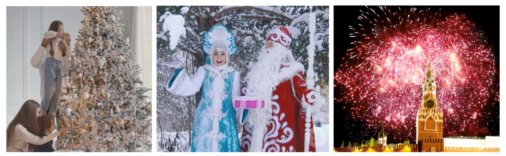 Задание 2. Лексическая разминка. Преподаватель демонстрирует ключевые кадры из видео (пример приведен на рис. 2), связанные с новогодними традициями. Студенты простыми фразами описывают, что они видят (например: Это елка. Это украшение елки), и обсуждают, какие новогодние традиции могут быть связаны с этими изображениями. Обсуждение помогает активировать предшествующие знания студентов и создает контекст для дальнейшего изучения темы.