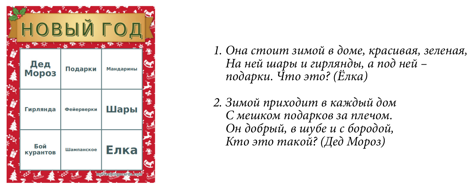 Задание 3. Новогоднее бинго. Далее преподаватель предоставляет список ключевых слов из видео: елка, гирлянда, шары, мандарины, подарки, Дед Мороз, шампанское, бой курантов, желания, фейерверки. Для активизации новой лексики мы выбрали игру «Новогоднее бинго», где в качестве вопросов использовали загадки. Как отмечает Е.П. Поползухина, загадки способствуют развитию речевых навыков и коммуникативной компетенции студентов [23]. Это не только помогает лучше запомнить новую лексику, но и подготавливает студентов к восприятию информации из видео о Новом годе в России.