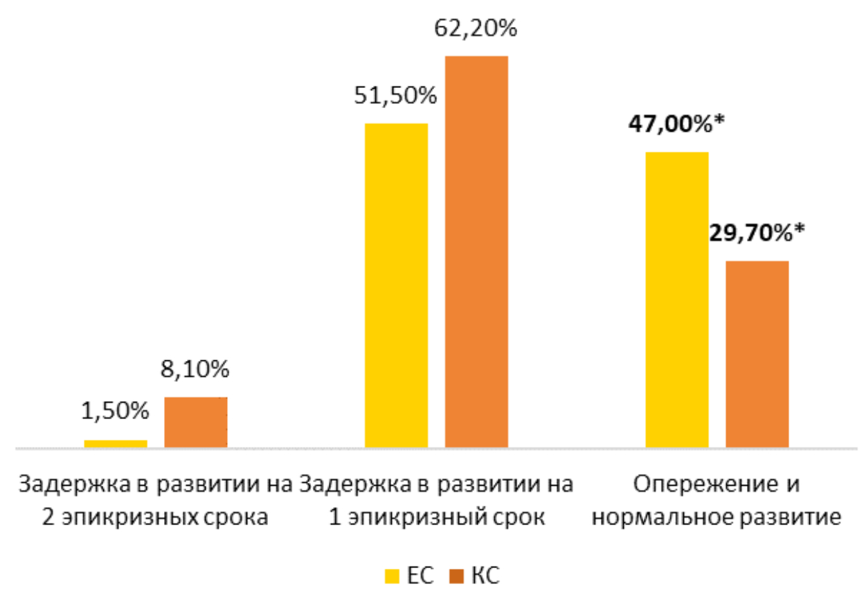 В ходе сравнительного анализа когнитивного развития детей на основе методики Г.В. Пантюхиной, К.Л. Печора, Э.Л. Фрухт были выявлены статистически значимые различия (р ≤ 0,05) между выборками по уровню нормального и опережающего развития по всему возрастному диапазону. Было обнаружено, что лишь 29,7 % детей, рожденных оперативным способом, имеют нормальный уровень развития. В группе физиологически рожденных детей данный показатель равен 47 % (см. рисунок).