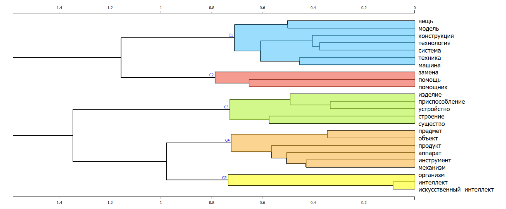 На основе заданного количества кластеров и визуального анализа выделено пять кластеров. Мера различий между кластерами составляет диапазон от 0 до 0.7–0.8. Кластер 1 (C1 сверху-вниз на рис. 1) составляет технико-механический кластер, представляет собой ядро технических определений, кластер наиболее плотного скопления схожих понятий. Отражает восприятие робота как технического устройства, инженерного артефакта, созданного для выполнения задач. Кластер 2 (С2) отражает социально-функциональный кластер, указывает на социальную роль робота: робот как субститут, дополнение человека. Кластер 3 (С3) указывает на искусственную природу робота, на имитацию реальных объектов. В этой связи появляется гибридное понимание робота, который представляет собой не просто инструмент (технические качества в виде «изделия», «устройства»), а сложную систему с элементами биоморфизма (антропоморфизм – существо). Кластер 4 (С4) представляет собой абстрактно-предметные определения, что указывает на собирательность образа робота в виде характеристик объектов реального мира («предмет», «продукт») и функционального устройства («аппарат», «инструмент») – робот как обобщенная категория. Кластер 5 (С5) представляет собой когнитивно-биологические аспекты робота: «организм» – уподобление живому, «интеллект» – атрибуция сознания. Крайняя степень очеловечивания робота, акцент на его «разумности», когнитивных возможностях.