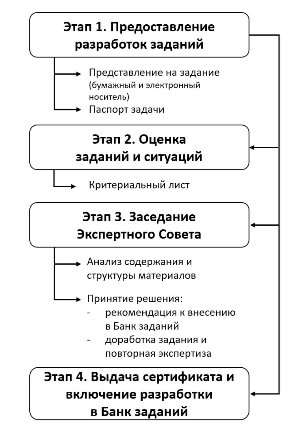 Для проведения экспертизы созданных заданий по оценке уровня сформированности функциональной грамотности и отбора лучших практик реализации курса внеурочной деятельности «Функциональная грамотность: учимся для жизни» [17] был создан экспертный совет по методической поддержке педагогов. Процедура работы совета кратко отражена в алгоритме, приведенном на рисунке 1.