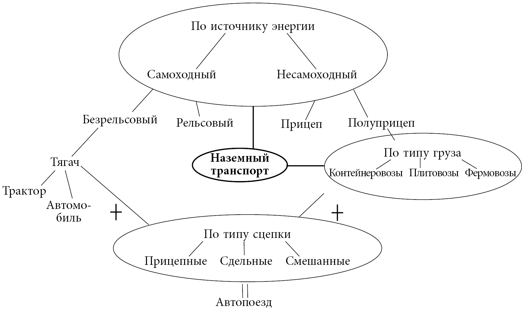 Каждое понятие схемы можно определить довольно четко с опорой на обозначенные в схеме связи понятий, например: контейнеровоз — это несамоходный вид наземного транспорта, представляющий собой полуприцеп и предназначенный для перевозки контейнеров. Вся схема может быть легко удержана в памяти и в нужный момент развернута в учебный текст. Покажем начало такого развертывания: Наземный транспорт по источнику самостоятельной энергии подразделяется на самоходный и несамоходный. К самоходному транспорту относят рельсовый транспорт и безрельсовый транспорт. Единицы безрельсового транспорта (автомобиль, трактор и др.) могут выступать в функции тягача при условии их сцепки с прицепом или полуприцепом...