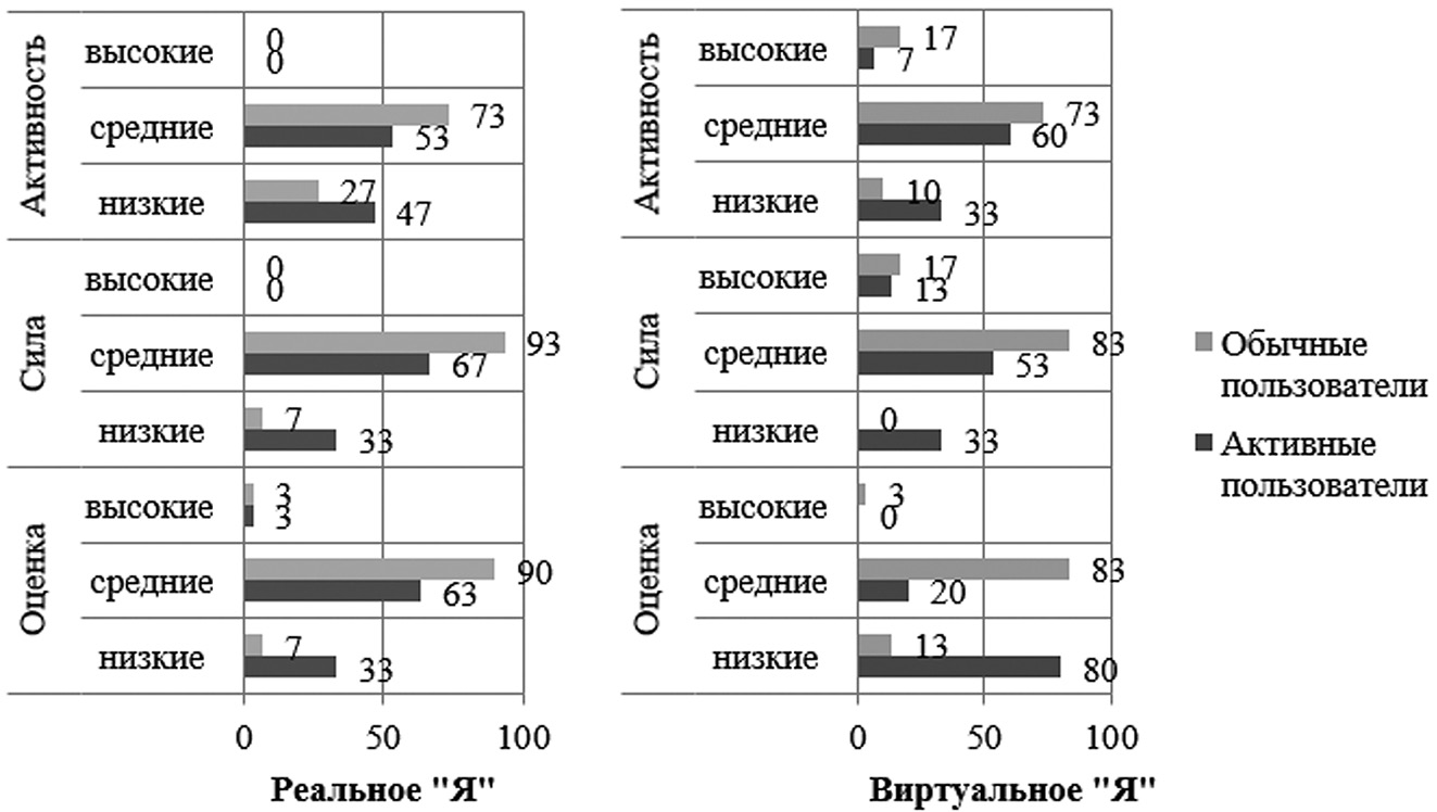 На основе описательного анализа результатов семантического дифференциала Ч. Осгуда можно сказать, что обычные пользователи в целом склонны оценивать свое виртуальное Я выше реального с точки зрения личного отношения к данному аспекту своей идентичности, оценки силы и активности этой части личности. Различия же в реальном и виртуальном образах у активных пользователей несущественны по факторам силы и активности, однако отношение к своему виртуальному Я связано с преобладанием низких оценок. Данная тенденция может быть связана с вероятной аггравацией своих отрицательных сторон идентичности в виртуале.