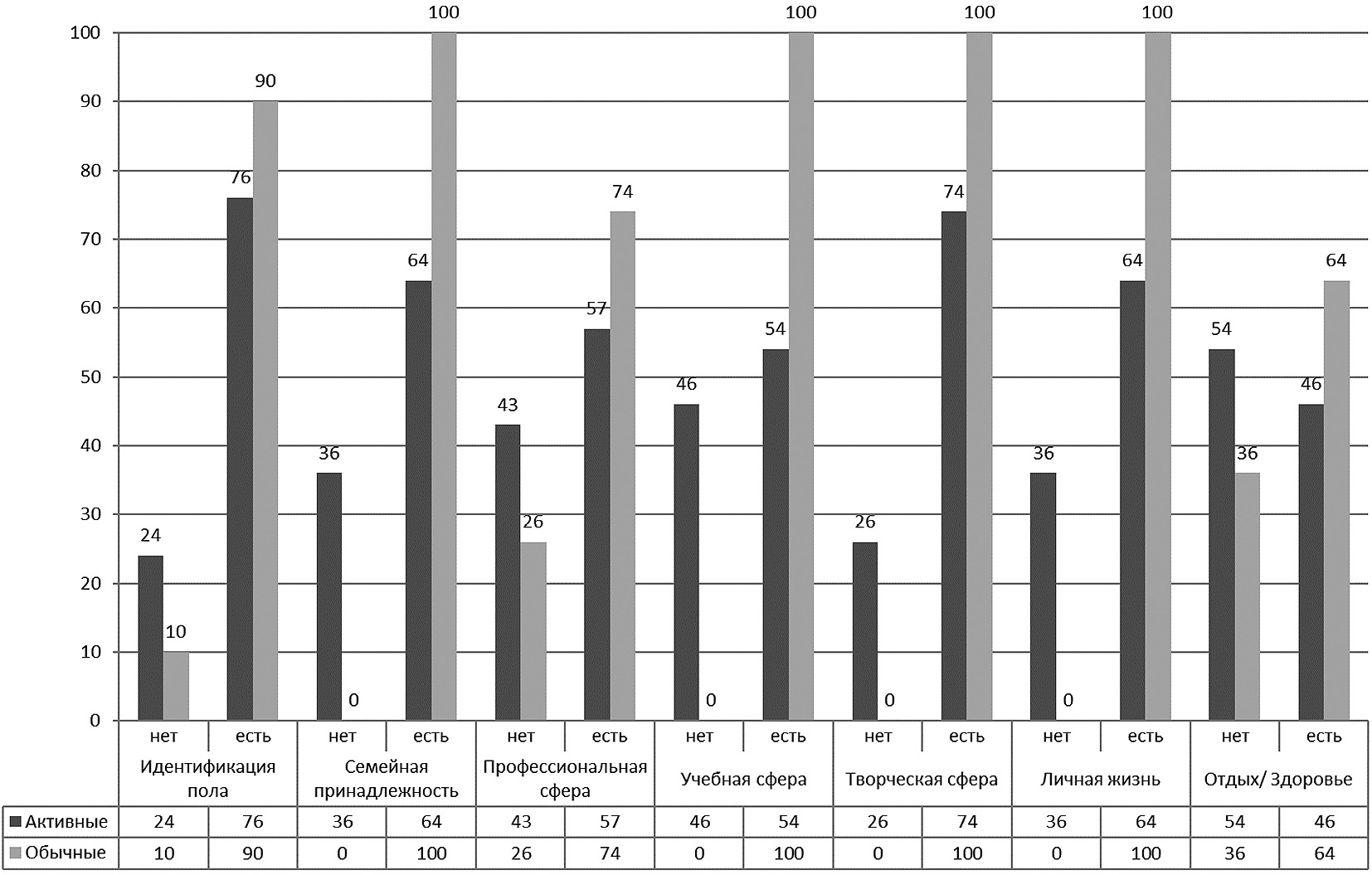 При сопоставлении данных, отраженных на рис. 2 и 3, видно, что картины выраженности и наполненности Я-образов в реале и онлайн в двух сравниваемых нами группах различны: у активных пользователей более наполненными и разнообразными оказываются характеристики сетевой идентичности, в то время как у обычных пользователей — реальной идентичности. Обнаруженные тенденции были проверены нами на значимость различий с помощью критерия углового преобразования Фишера. Значимые различия в показателях наполненности (множественности) Я-образов в реале между сравниваемыми группами обнаружены по следующим сферам: идентификация пола (p ≤ 0,05), семейная, учебная и творческая сфера, личная жизнь, отдых/здоровье (p ≤ 0,01). То есть по всем сферам реальной жизни, кроме профессиональной, в группе обычных пользователей представлено больше образов Я. Сопоставление этого же показателя для образов, представленных онлайн, дало противоположную картину различий с теми же самыми уровнями значимости: по всем сферам виртуальной жизни, кроме профессиональной, в группе активных пользователей представлено больше образов Я. Проведенный анализ доказывает наше предположение о том, активные пользователи социальных интернет-сетей имеют больше вариантов Я-образов в виртуальном пространстве.