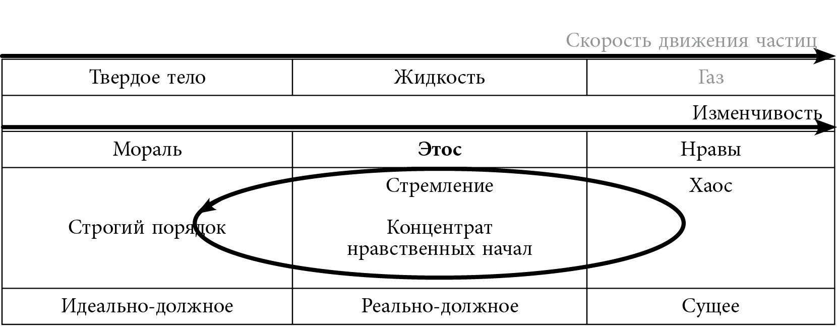 Важно, что само понятие этоса занимает промежуточную позицию между устойчивой моралью и быстро меняющимися нравами [19, 20, 32], подобно положению жидкости между твердым телом и газом с точки зрения строения вещества и скорости движения частиц, его составляющих; попробуем представить эту идею на рис. 1.
