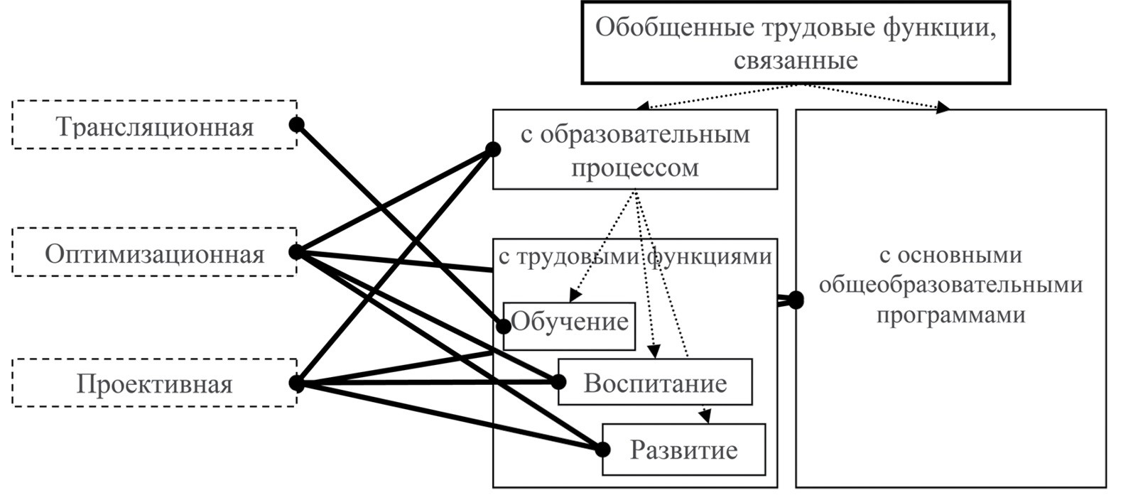 При анализе сущности профессиональной педагогической деятельности в качестве функций педагогов внутри нее можно выделить следующие: трансляционная, оптимизационная и проективная. Данные функции неплохо согласуются с обобщенными трудовыми функциями, обозначенными в профессиональном стандарте педагога (рис. 2).