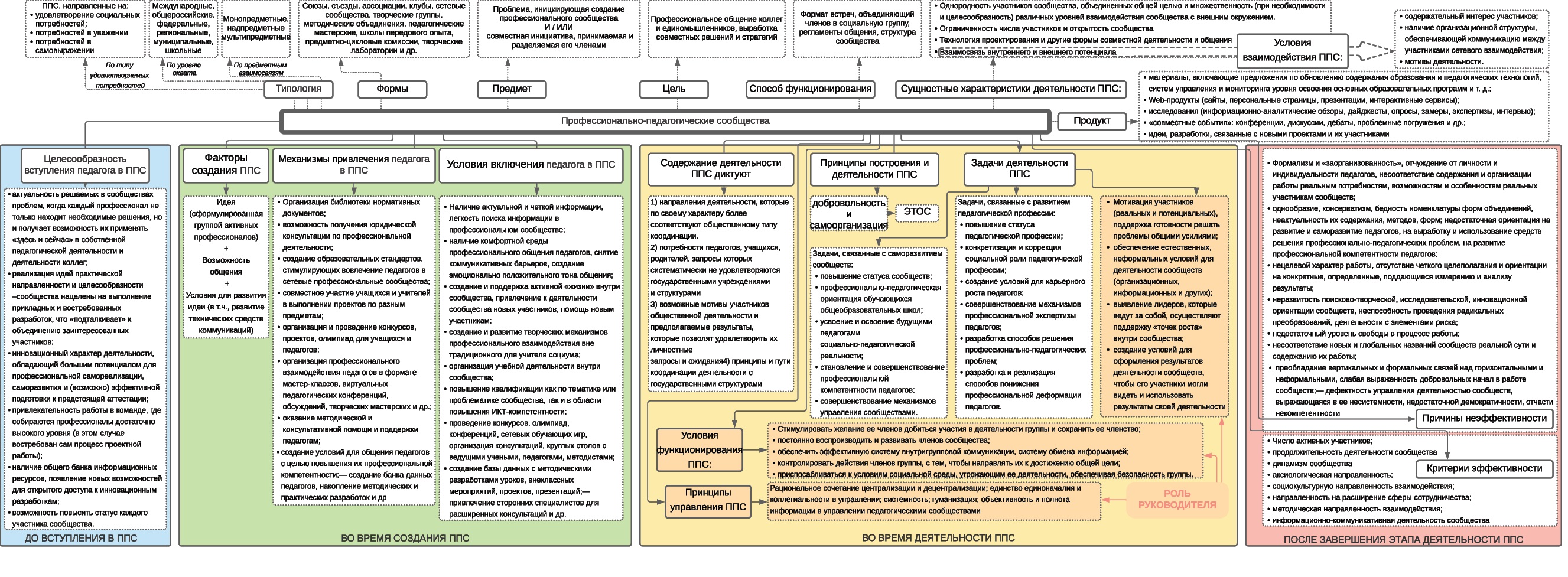 Большой объем представленной в статье информации, касающейся профессионально-педагогического сообщества, представим наглядно в виде ментальной карты (рис. 3), включающей цель, предмет, формы, типы, характеристики и способы деятельности профессионально-педагогического сообщества на каждом этапе его функционирования, продукт, получаемый на выходе этой деятельности, а также взаимосвязь между указанными категориями.