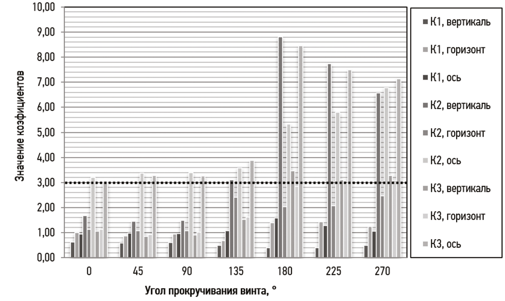 - факт наличия ослабления крепежного элемента, вызванного его раскручиванием, можно безошибочно установить только по коэффициентам К2 (вертикаль) и К3 (вертикаль, горизонт). Однако это возможно не при всех исследуемых степенях затяжки винта. У прочих коэффициентов были выявлены некоторые недостатки: К1 (вертикаль, горизонт, ось) и К2 (горизонт) не превысили установленный критический порог для данной методики при всех рассмотренных степенях затяжки винта. В то же время коэффициенты К2 (ось) и К3 (ось) превысили этот порог при исходном положении крепежного винта, т.е. в случае, когда он был полностью закручен. По этим причинам коэффициенты К1 (вертикаль, горизонт, ось), К2 (горизонт, ось) и К3 (ось) не были включены в дальнейший анализ. На рис. 1 представлены данные из табл. 2, иллюстрирующие распределение значений коэффициентов по различным степеням затяжки винта относительно критического порога (численное значение равное 3,0);