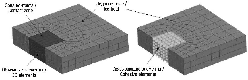 В задачах ледовой механики в МСЭ-подходе сплошное ледовое поле строится в КЭ-постановке и состоит из основных (bulk) и вспомогательных (связывающих, cohesive) элементов (см. рис. 2) [6, 7]. В качестве основных элементов принимается сплошное ледовое поле, разбитое на n конечных элементов. Связывающие элементы в модели ледового поля выполняют роль трещин. При достижении критических напряжений трещины раскрываются путем удаления соответствующих когезионных элементов. В отличие от рассмотренных выше методов, в CZM-постановке разрушенные элементы не удаляются из модели, а, наоборот, присутствуют в ней в виде ледовых обломков, взаимодействующих с сооружением и между собой. Таким образом, одним из важнейших аспектов CZM-модели является учет процесса перехода сплошного ледового образования при его разрушении к дискретному (образование фрагментов льда).