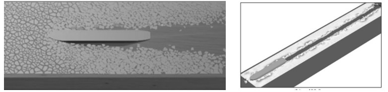 При динамическом нагружении (v=1 м/с) ледовая среда испытывает значительные инерционные эффекты, что ускоряет процесс разрушения. В зоне хрупкого разрушения лед практически не проявляет пластических деформаций, а трещинообразование происходит резко и распространяется с высокой скоростью, рисунок 10. Это приводит к хрупкому отколу больших фрагментов материала. В отличие от квазистатического режима, при динамическом воздействии лед не успевает перераспределить напряжения, что делает его менее устойчивым к разрушению и вызывает внезапные структурные изменения.
