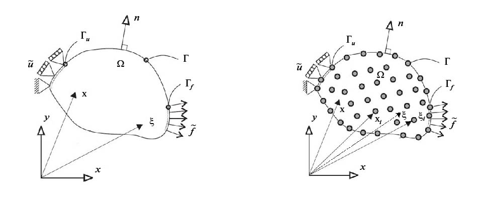 Основными характерными компонентами бессеточного метода являются: построение аппроксимации решения с помощью функций формы; построение дискретной формы уравнения равновесия; построение дискретной формы граничных и начальных условий [35, 36].