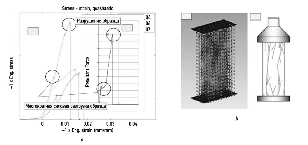 Рис. 9. Численное моделирование квазистатических испытаний на одноосное сжатие (v=1 см/с): a — кривые деформирования (зона хрупкого разрушения); b — характерная картина распространения повреждений, по материалам работ авторов [35, 36]. Метод SPG.