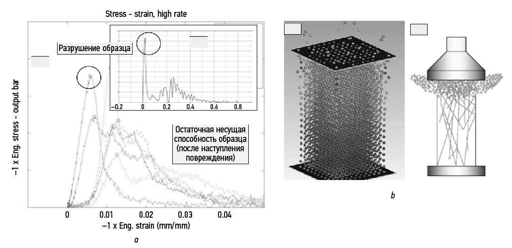 Рис. 10. Численное моделирование динамических испытаний на одноосное сжатие (v=1 м/с): a — кривые деформирования (зона хрупкого разрушения); b — характерная картина распространения повреждений, по материалам работ авторов [35, 36]. Метод SPG.